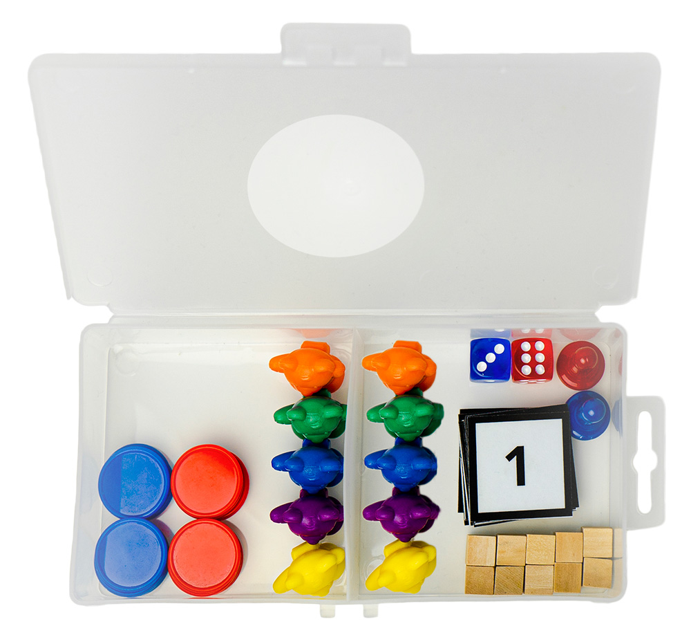 Alle benodigde materialen om handelend te rekenen zijn verzameld in één rekenbakje (18 cm x 9 cm x 4 cm). Zo gaat er geen tijd van de rekenles verloren en hoef je als leerkracht niet zelf steeds alle materialen voorzien. Iedere leerling heeft zijn eigen rekenbakje.